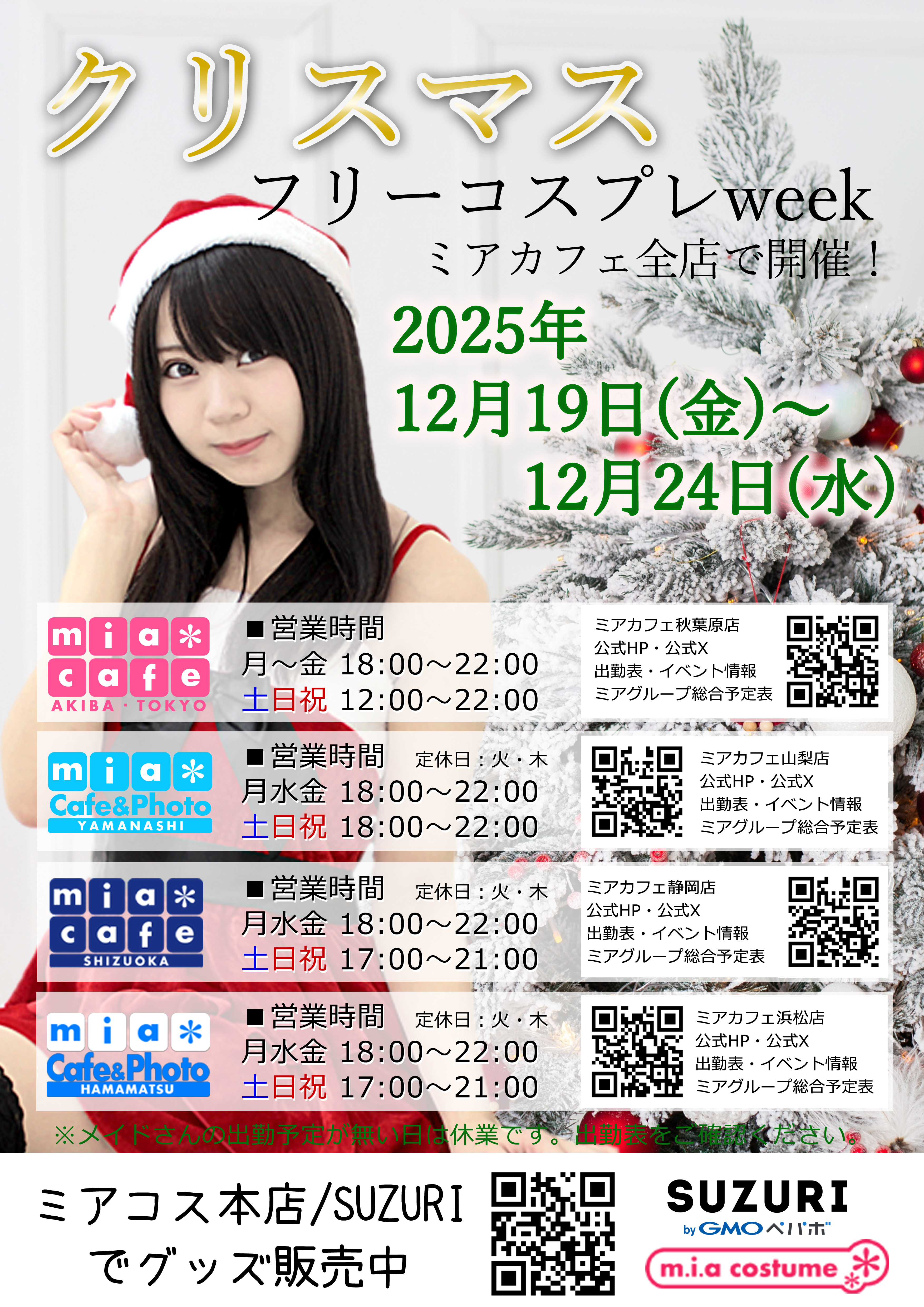 クリスマスフリーコスプレウィークinミアカフェ秋葉原店![]() 期間中は、クリスマスのためフリーコスプレ期間となります。 メイドさんが個人で持ってきた衣装を着たり、ミアコスチューム提供の衣装を着たり 自由な衣装での接客となります! ■開催期間 2025年12月19日(金)〜2025年12月24日(水) 実施期間中のスタッフが店舗出勤日のみイベント対象です ■出勤予定 ・ミアカフェ秋葉原店 http://pandaland.cutegirl.jp/mif/c_cms_csv/sch_top.php http://x.com/mia_group ・ミアカフェ&フォト山梨店 http://beautybeast.main.jp/mif/c_cms_csv/sch_top.php http://x.com/miakofucity ・ミアカフェ&フォト静岡店 http://egoiste.bambina.jp/mia/c_cms_csv/sch_top.php http://x.com/shizuokamaidsan ・ミアカフェ&フォト浜松店 http://egoiste.bambina.jp/mia/c_cms_csv/sch_top.php http://twitter.com/mia053maidcafe ●イベント着用衣装● 店舗によって着用衣装は異なります 【衣装提供】ミアコスチューム http://mia.shop-pro.jp/ ・ミアカフェ・ミニ制服 クリスマス http://miacos.jp/?pid=80379609 ・マオメイド クリスマス http://miacos.jp/?pid=79910355 ・三段フリルサンタ http://miacos.jp/?pid=80816468 ・トナカイサンタコスチューム http://miacos.jp/?pid=165559346 ![]() |