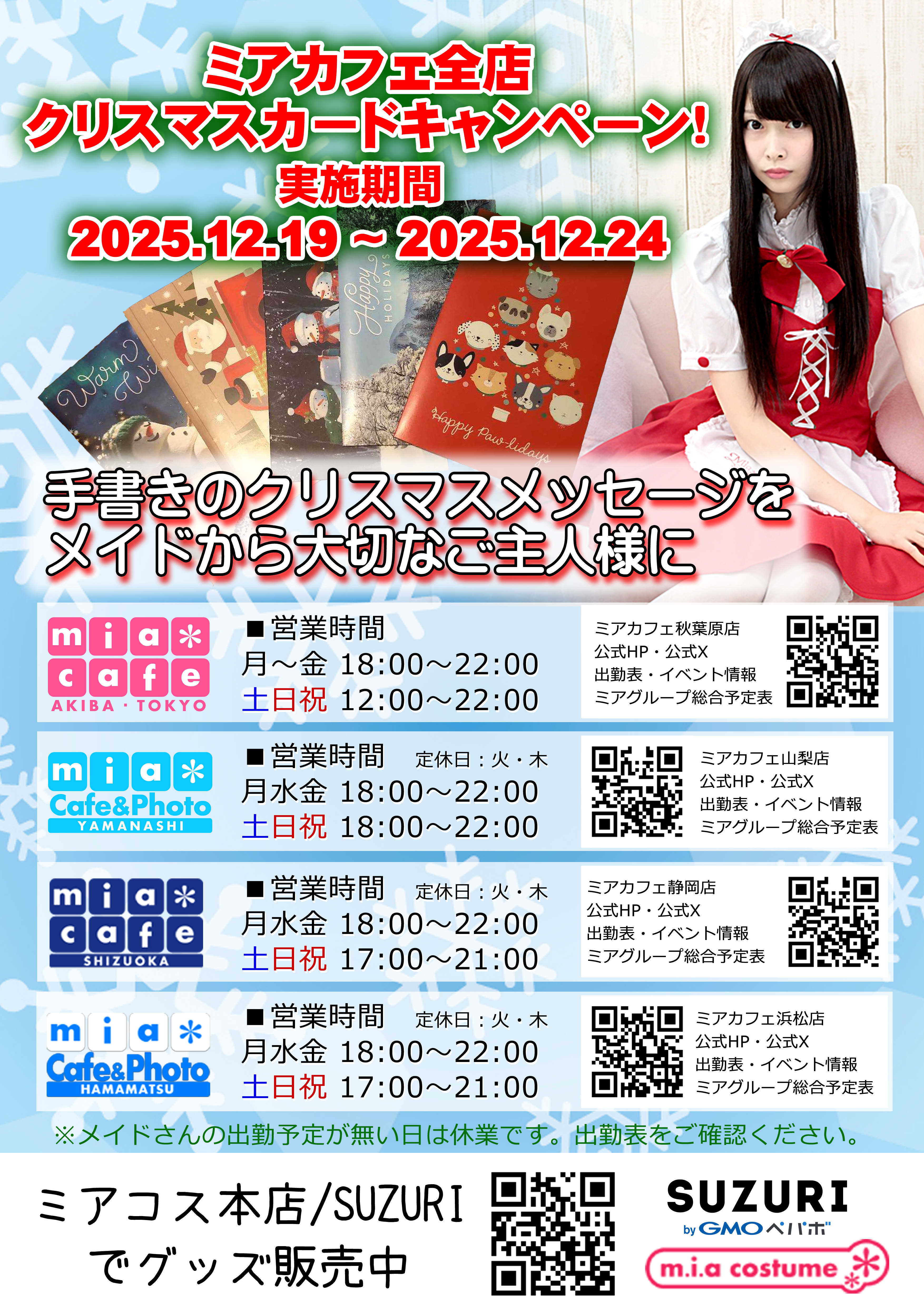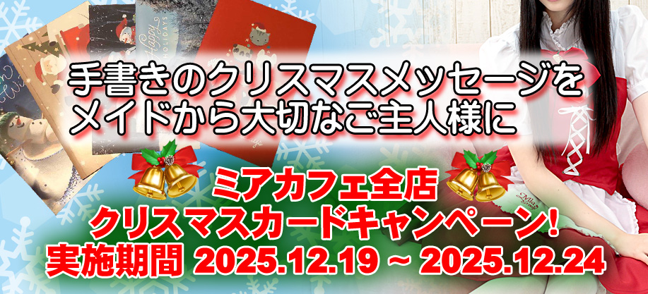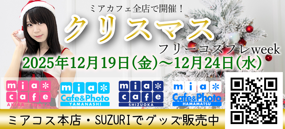ミアカフェ全店クリスマスカードキャンペーン!![]() ミアカフェではいつも来店いただいているお客様へ感謝の気持ちとして、 期間中はアメリカ製の高級クリスマスカードを メイドさんがその場でメッセージを書いて配布してくれます! 各店舗先着12名または24名様限定です! ■開催期間 2025年12月19日(金)〜2025年12月24日(水) ■実施店舗(無くなり次第終了です) ・ミアカフェ秋葉原店 配布枚数 先着24名様 ・ミアカフェ山梨店 配布枚数 先着12名様 ・ミアカフェ静岡店 配布枚数 先着12名様 ・ミアカフェ浜松店 配布枚数 先着12名様 実施期間中のスタッフが店舗出勤日のみイベント対象です ■出勤予定 ・ミアカフェ秋葉原店 http://pandaland.cutegirl.jp/mif/c_cms_csv/sch_top.php http://x.com/mia_group ・ミアカフェ&フォト山梨店 http://beautybeast.main.jp/mif/c_cms_csv/sch_top.php http://x.com/miakofucity ・ミアカフェ&フォト静岡店 http://egoiste.bambina.jp/mia/c_cms_csv/sch_top.php http://x.com/shizuokamaidsan ・ミアカフェ&フォト浜松店 http://egoiste.bambina.jp/mia/c_cms_csv/sch_top.php http://twitter.com/mia053maidcafe ![]() |