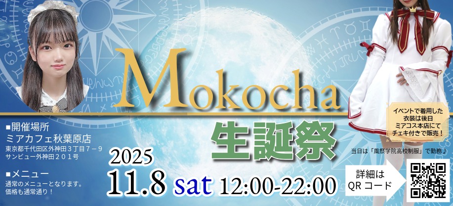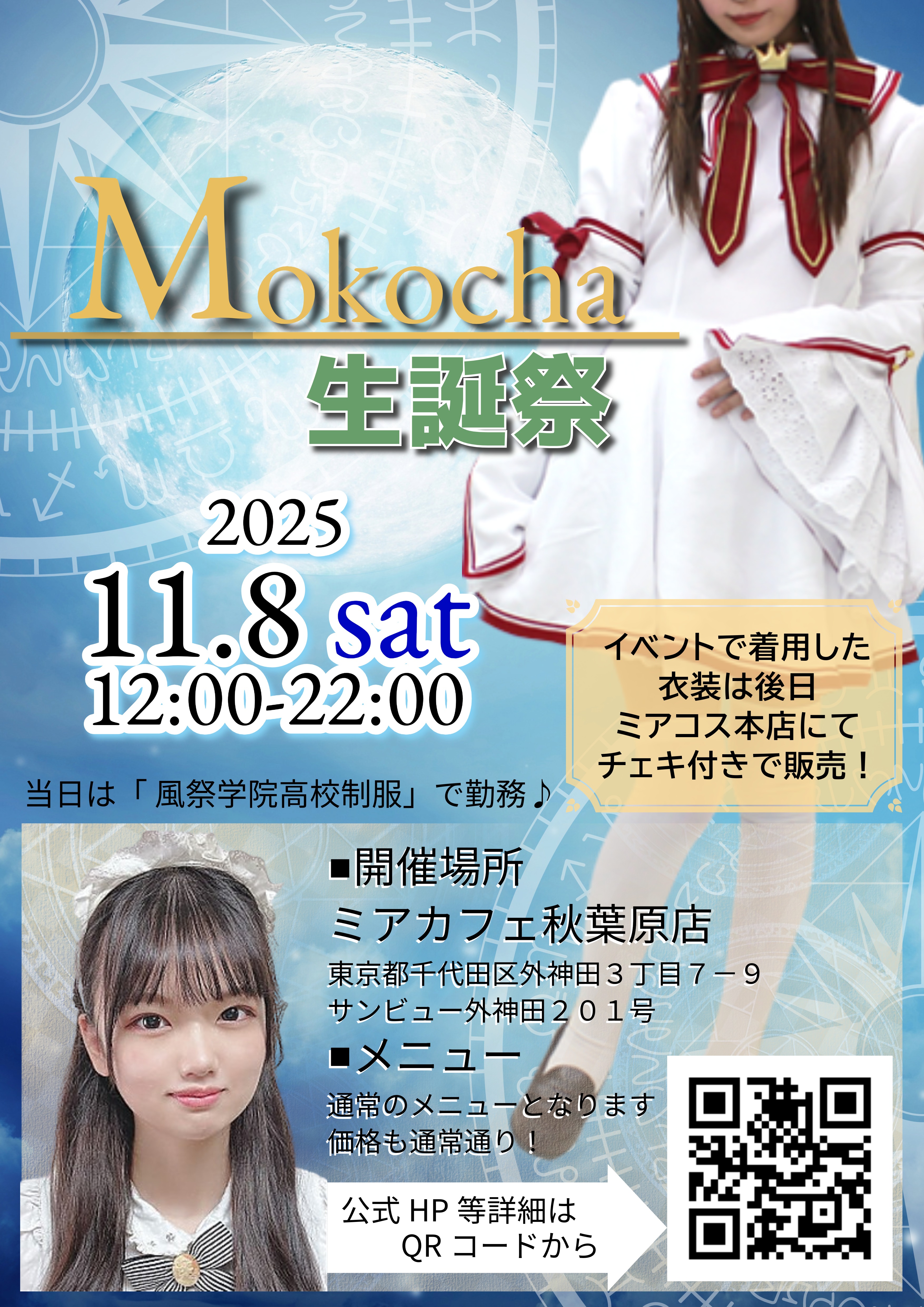 もこちゃ生誕祭イベント!inミアカフェ秋葉原店![]() ミアカフェ秋葉原店もこちゃちゃん生誕祭イベント開催決定! ▼もこちゃちゃん http://x.com/miamaid101 http://pandaland.cutegirl.jp/mif/c_cms_csv/prof.php?page=215 もこちゃちゃんには、ミアコスより衣装を1着プレゼント! ミアコスのコスプレ衣装で接客してくれるもこちゃちゃんに是非会いに来てください! ■開催日時(下記日程には周年イベントのメイドさんは出勤確定!) 2025年11月8日(土) 12:00〜22:00 ■開催場所 ミアカフェ秋葉原店(メイド喫茶) http://lamoe.oops.jp/miacafe1/inf10.cgi?mode=main&cno=25 ■メニューその他 メニューやチャージ等は通常のメニューが中心となります。価格も通常通りです! ■イベントグッズをメイドカフェ・ミアカフェ★オリジナルグッズショップ!にて販売中! http://suzuri.jp/miacafe ●イベント着用衣装● 衣装提供 ミアコスチューム http://mia.shop-pro.jp/ ・Rewrite(リライト)風祭学院高校制服 色:白 サイズ:M/BIG 本店 http://miacos.jp/?pid=107091418 楽天 http://item.rakuten.co.jp/miacostume/nh2076siz/ ヤフーショッピング http://store.shopping.yahoo.co.jp/cosplaymode/nh2076siz.html au PAY マーケット http://wowma.jp/item/306478745 ●イベント衣装で着用した衣装の後日販売● イベントで着用したコスプレ衣装をミアコス本店にて後日着用チェキ付きで販売! 売れた金額の一部がメイドさんに還元されます! http://mia.shop-pro.jp/?mode=cate&cbid=2433636&csid=0&sort=p ![]() |