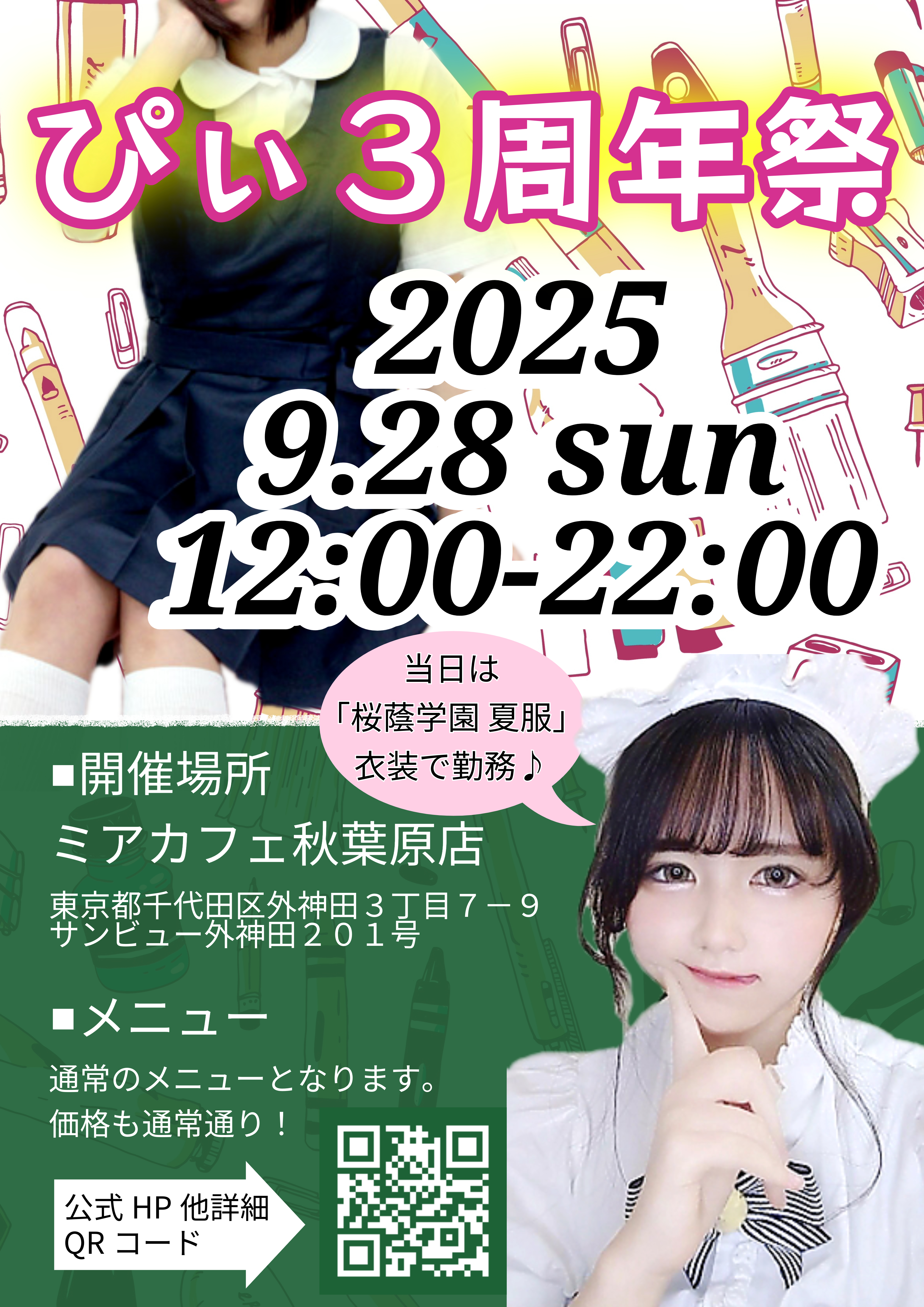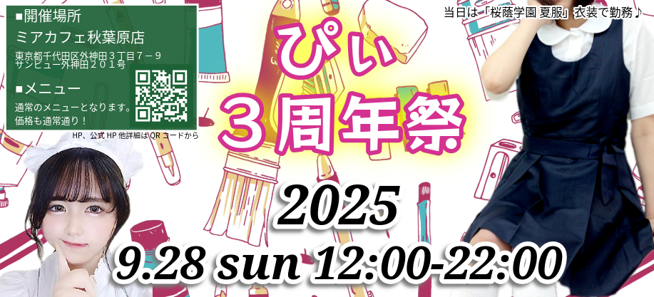 ぴぃちゃん3周年祭イベント!inミアカフェ秋葉原店![]() ミアカフェ秋葉原店のぴぃちゃん3周年祭イベント開催決定! ▼ぴぃちゃん http://x.com/miamaid103a http://pandaland.cutegirl.jp/mif/c_cms_csv/prof.php?page=224 ぴぃちゃんには、ミアコスより衣装を1着プレゼント! ミアコスのコスプレ衣装で接客してくれるぴぃちゃんに是非会いに来てください! ■開催日時(下記日程には周年イベントのメイドさんは出勤確定!) 2025年9月28日(日) 12:00〜22:00 ■開催場所 ミアカフェ秋葉原店(メイド喫茶) http://lamoe.oops.jp/miacafe1/inf10.cgi?mode=main&cno=25 ■メニューその他 メニューやチャージ等は通常のメニューが中心となります。価格も通常通りです! ■イベントグッズをメイドカフェ・ミアカフェ★オリジナルグッズショップ!にて販売中! http://suzuri.jp/miacafe ●イベント着用衣装● 衣装提供 ミアコスチューム http://mia.shop-pro.jp/ ・桜蔭学園 桜蔭中学校高等学校 夏服 本店 http://miacos.jp/?pid=96082432 楽天 http://item.rakuten.co.jp/miacostume/hb3106siz/ ヤフーショッピング http://store.shopping.yahoo.co.jp/cosplaymode/hb3106siz.html au PAY マーケット http://wowma.jp/item/580512619 ●イベント衣装で着用した衣装の後日販売● イベントで着用したコスプレ衣装をミアコス本店にて後日着用チェキ付きで販売! 売れた金額の一部がメイドさんに還元されます! http://mia.shop-pro.jp/?mode=cate&cbid=2433636&csid=0&sort=p ぴぃちゃんの今回の衣装 → 今回販売ありません。 ![]() |