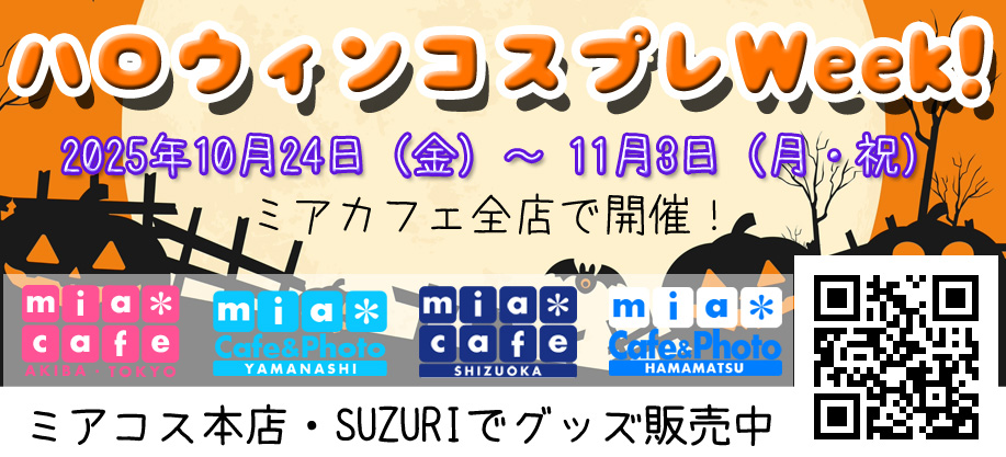 ハロウィンフリーコスプレウィークinミアカフェ秋葉原店![]() 期間中は、ハロウィンのためフリーコスプレ期間となります。 メイドさんが個人で持ってきた衣装を着たり、ミアコスチューム提供の衣装を着たり 自由な衣装での接客となります! ■開催期間 2025年10月24日(金)〜2025年11月3日(月・祝) 実施期間中のスタッフが店舗出勤日のみイベント対象です ■出勤予定 ・ミアカフェ秋葉原店 http://pandaland.cutegirl.jp/mif/c_cms_csv/sch_top.php http://x.com/mia_group ・ミアカフェ&フォト山梨店 http://beautybeast.main.jp/mif/c_cms_csv/sch_top.php http://x.com/miakofucity ・ミアカフェ&フォト静岡店 http://egoiste.bambina.jp/mia/c_cms_csv/sch_top.php http://x.com/shizuokamaidsan ・ミアカフェ&フォト浜松店 http://egoiste.bambina.jp/mia/c_cms_csv/sch_top.php http://twitter.com/mia053maidcafe ●イベント着用衣装● 店舗によって着用衣装は異なります 【衣装提供】ミアコスチューム http://mia.shop-pro.jp/ ・マオメイド パンプキン http://mia.shop-pro.jp/?pid=79910242 ・ミアカフェ・ミニ制服 パンプキン http://mia.shop-pro.jp/?pid=80379485 ・スプラッターナース サイズ:Ladies http://mia.shop-pro.jp/?pid=182586818 ・スプラッターガール ピンクナース サイズ:レディース http://mia.shop-pro.jp/?pid=146592887 ![]() |