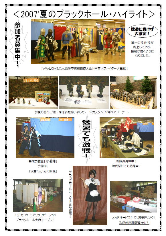 ![]() ミアカフェ・ミアリラクゼーションでは、コンバットマガジンの協賛で「ミアカフェ・ミアリラクゼーション ブラックホール支店2007夏」を開催します。 オフィシャルサイト http://www.blackholeshow.com/ 協賛:コンバットマガジン http://www.monomaga.net/wpp/shop/category_list.aspx?CD=C0000014&WKCD=C0000023 2007年8月11日(土)AM10:00〜PM5:00 2007年8月12日(日)AM10:00〜PM4:00 2日間限り 入場料 1200円 小学6年生まで無料 都立産業貿易センター浜松館 http://www.blackholeshow.com/kotuh.html とても大きなスペースを使って、ミアカフェ・ミアリラクゼーションの臨時店舗を出店致します! 是非ともご参加下さい! |