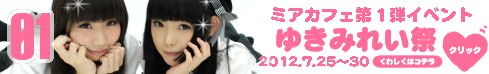 ![]() ![]() お待たせいたしました!急遽イベント開催決定です! その名も『ゆきみれい祭』!! ミアリラ所属のなかよしコンビゆきみちゃん&みれいちゃんを『推す!』イベントです。 期間中は、ゆきみちゃん&みれいちゃんの出現率もアップ致します! スタッフ推しイベント第1弾となりますので、是非のぞいていって下さいませ。 イベント実施期間: 2012年7月25日(水)〜30日(月) グッズ販売: ゆきみれいストラップ(20個限定) ¥1,000 ゆきみれいブロマイドセット(2枚入) ¥1,000 ゆきみれいサイン入りポスター(20個限定) ¥2,000 グッズを全部あつめると『フルコンプリートカード』がもらえます! 今後もスタッフ推しイベントシリーズ化を予定しておりますので、 是非第1弾から集めていって下さいませ☆ ※グッズのネット転載等はご遠慮下さい。 【ゆきみちゃん】(画像:左) 所属:ミアリラクゼーション 兼務:ミアカフェ、ミアガイド、ミアティアラ なまえのとおり色白美少女なゆきみちゃん! カフェで会っても、リラクゼーションでマッサージしてもらってもとっても癒してくれるメイドさんです☆ ブログ『雪見はだいふく』:http://ameblo.jp/miatiara-yukimi/ 【みれいちゃん】(画像:右) 所属:ミアリラクゼーション 兼務:ミアカフェ、ミアガイド、ミアティアラ お菓子づくりが得意なみれいちゃん! 黒髪美少女で見とれてしまいます。でもブログがおもしろいんです☆ ブログ『みれいのじょーじょーゆーじょー日記』:http://ameblo.jp/miatiara-mirei/ |